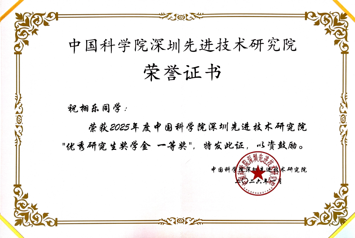 恭贺祝栩乐同学荣获2025年度中国科学院深圳先进技术研究院“优秀研究生奖学金 一等奖”