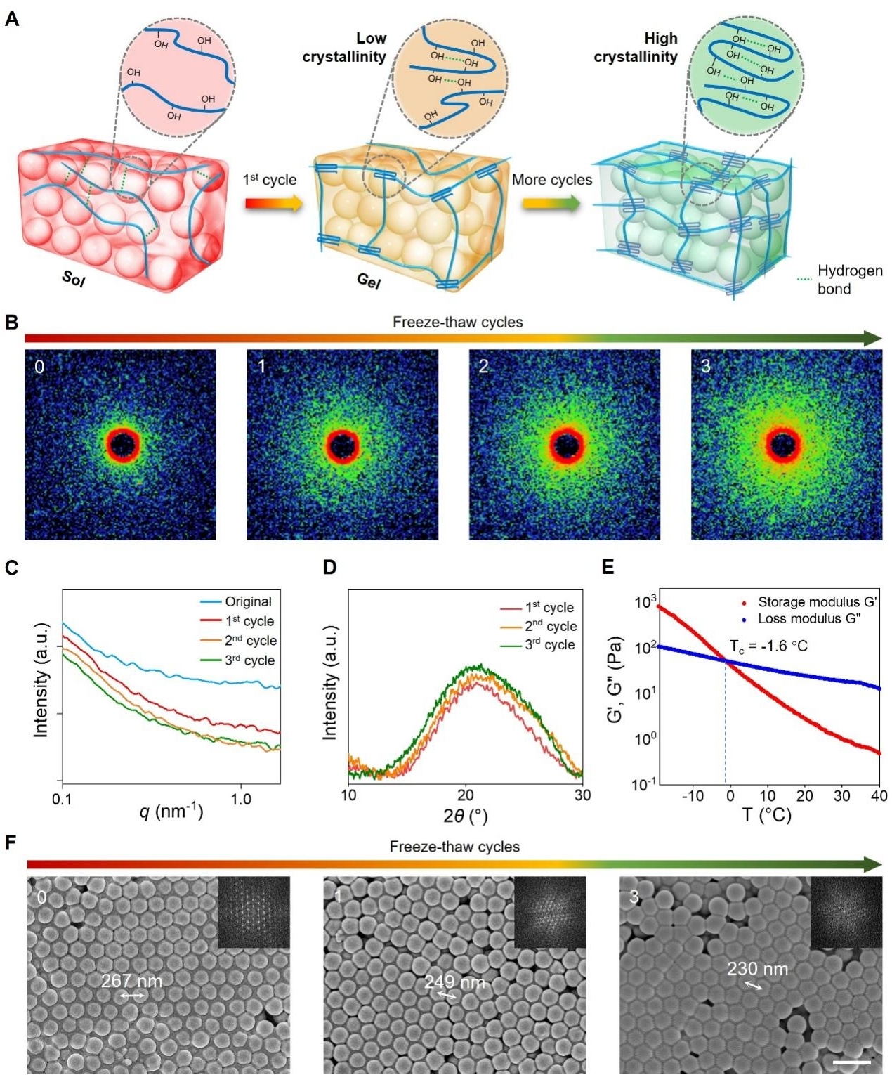 图3 FT-SCLs的冻融监测原理。(A-E)FT-SCLs随冻融循环的结晶度变化及溶胶-凝胶转变。(F)FT-SCLs随冻融循环的结构变化。